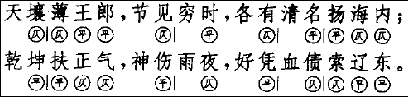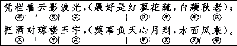 为了帮助欣赏,加强诵读的效果,除句末外,其余关键性的字也一并标出平仄(注意这里和以后标明的平仄都是上下联相反的),并用一竖表示句中节奏停顿处。