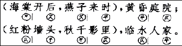这似乎与三个单句一样,但它们的结构是不同的。括弧表示二句合成一段。前二后一的如今人秦瘦鸥所著小说《秋海棠》中一副集宋词联,上联句末仄、平、仄,下联句末平、仄、平:
